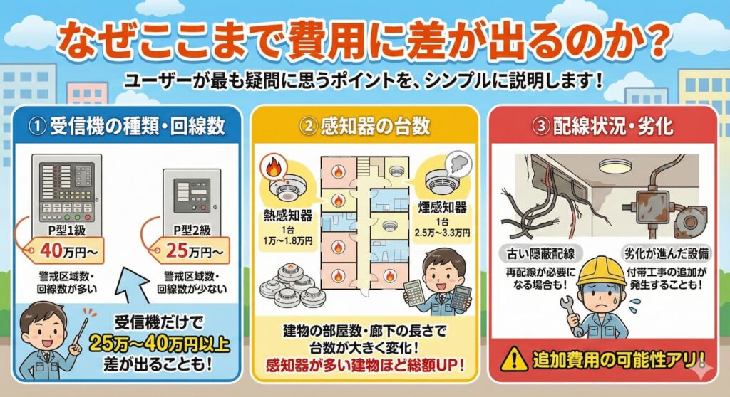 建物の所有者・管理者・占有者様が疑問に思う、自動火災報知設備の工事費に差が出る主な理由として、受信機の種類(P型1級・2級)による機器価格の違い、建物の広さや間取りに応じた感知器の必要台数、そして既存配線の劣化状況に伴う再配線工事の有無という3つのポイントを挙げ、見積もりが変動する仕組みとなっております。