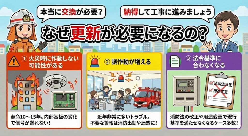 消防用設備の更新が必要な理由は、経年劣化により「いざという時に作動しない」リスクや「誤作動」によるトラブルが増えること、さらに法改正や用途変更で「法令基準を満たせなくなる」可能性があるためであり、これらを理解し納得した上で工事に進むことをお勧め致します。