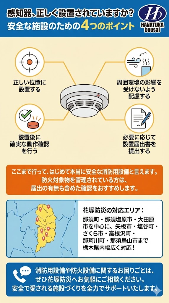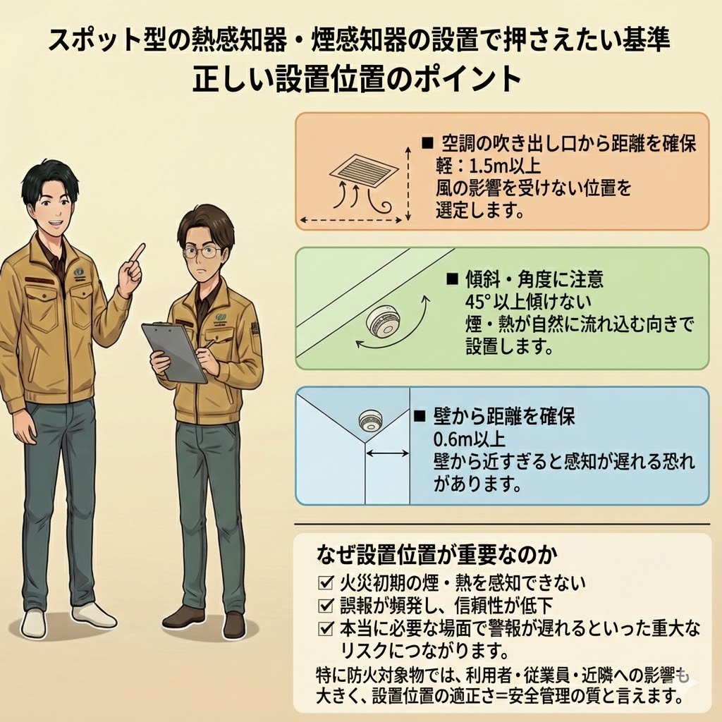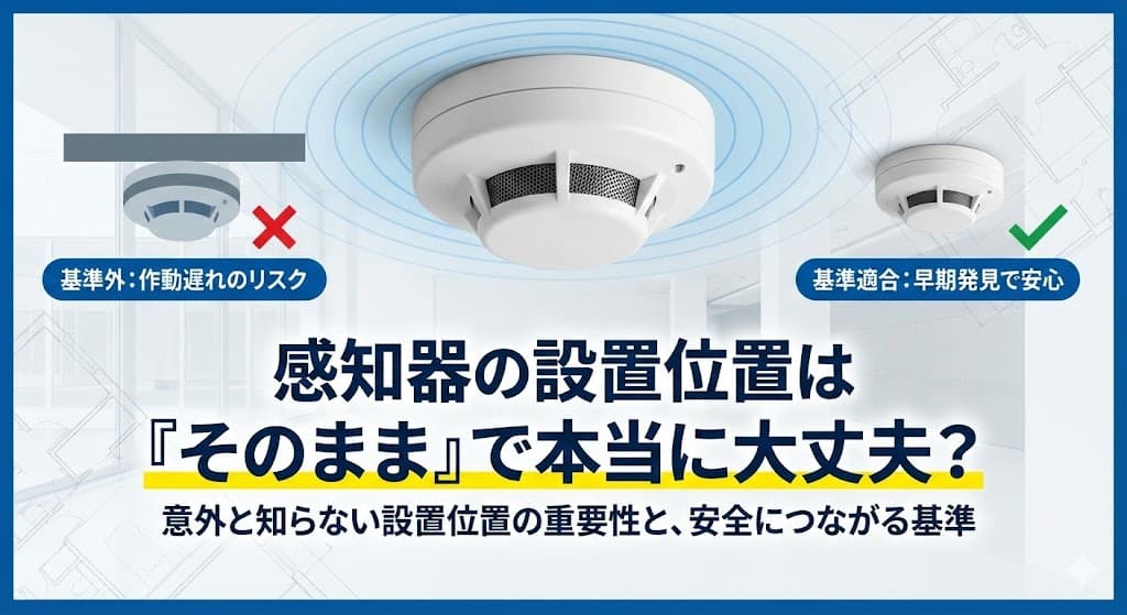 各種施設に設置されている 感知器(自動火災報知設備)。「設置されているから安心」と思われがちですが、設置位置が基準から外れていることで、正常に作動しない・誤作動を起こすケースは決して少なくありません。今回は、防火対象物における感知器の設置位置調整を例に、「感知器の正しい設置位置の考え方」と「基準を外れた場合に生じるリスク」について解説します。