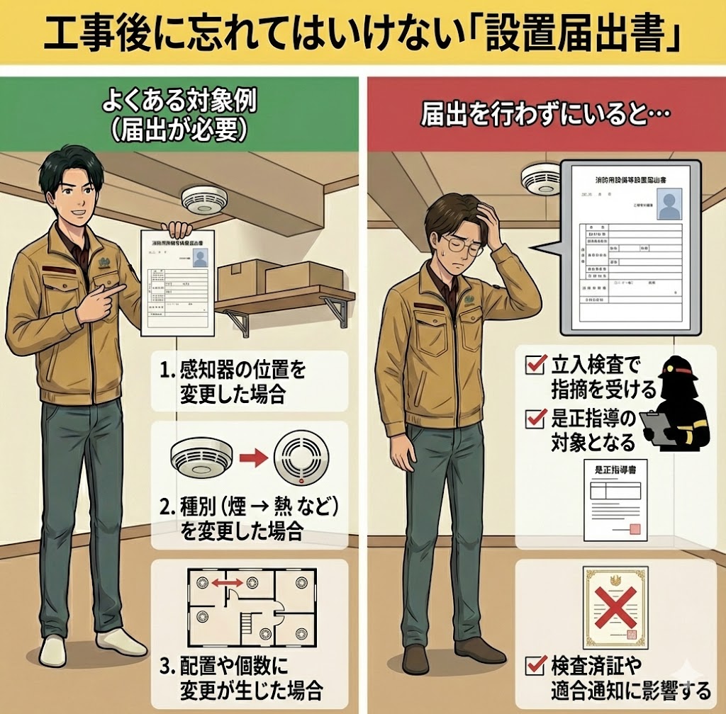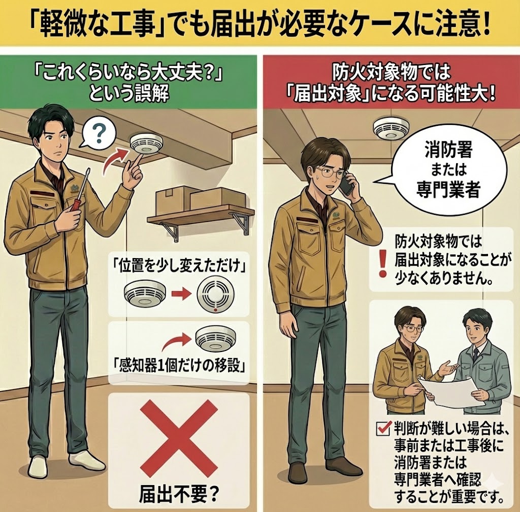判断が難しい場合は、事前または工事後に 消防署または専門業者へ確認することが重要です。